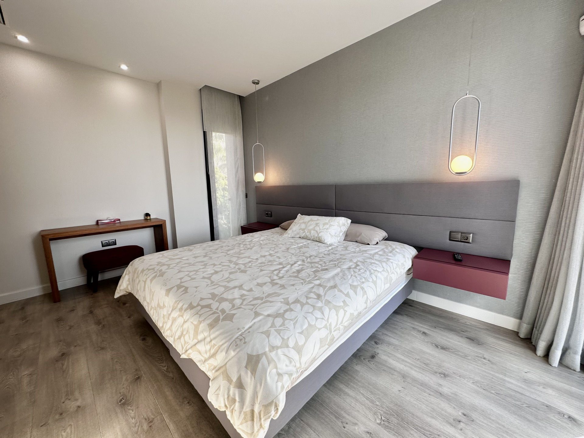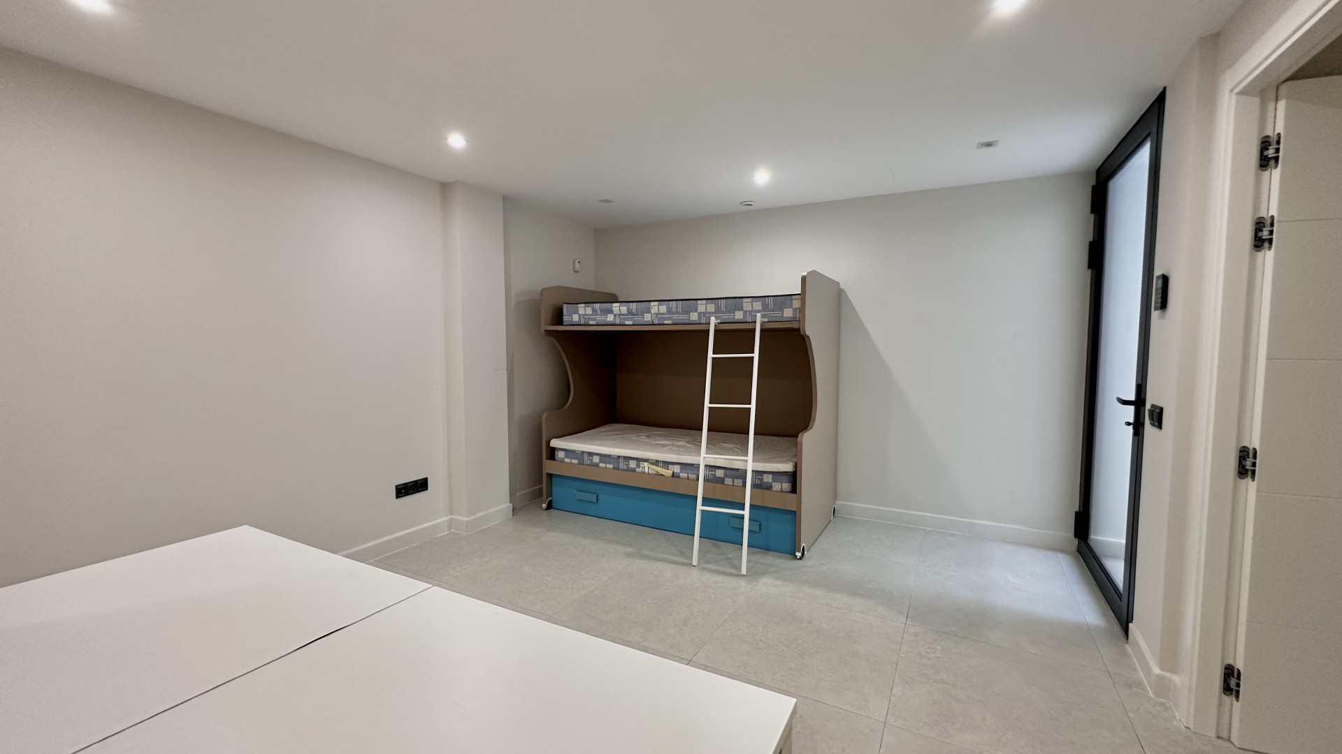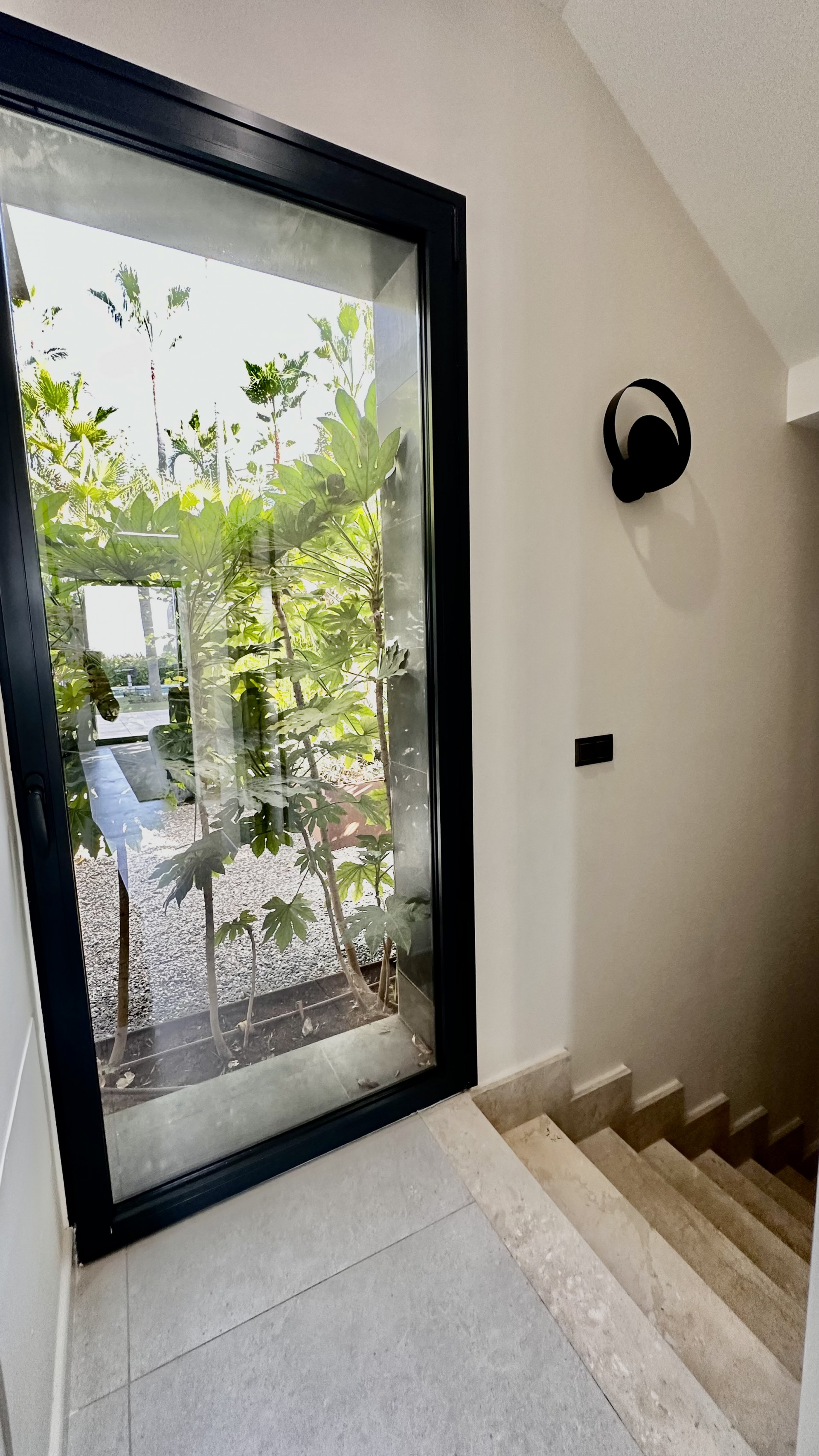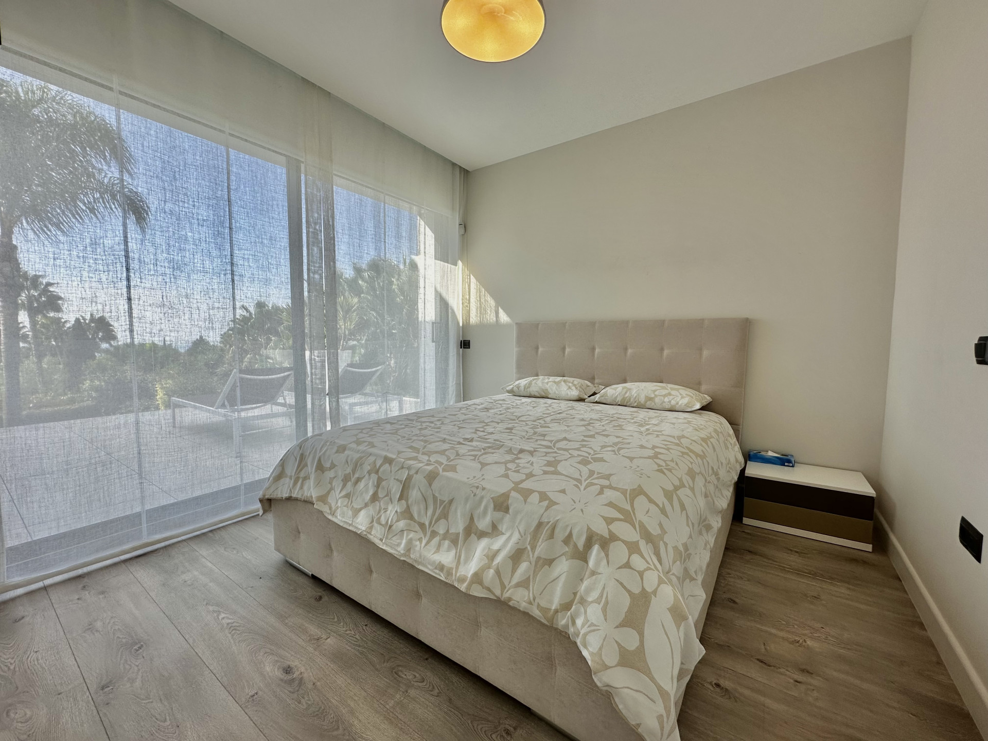 The ground floor consists of a spacious living room with open plan fully equipped kitchen and leads to the covered terraces and a garden, huge windows allows to have natural light all day around.
