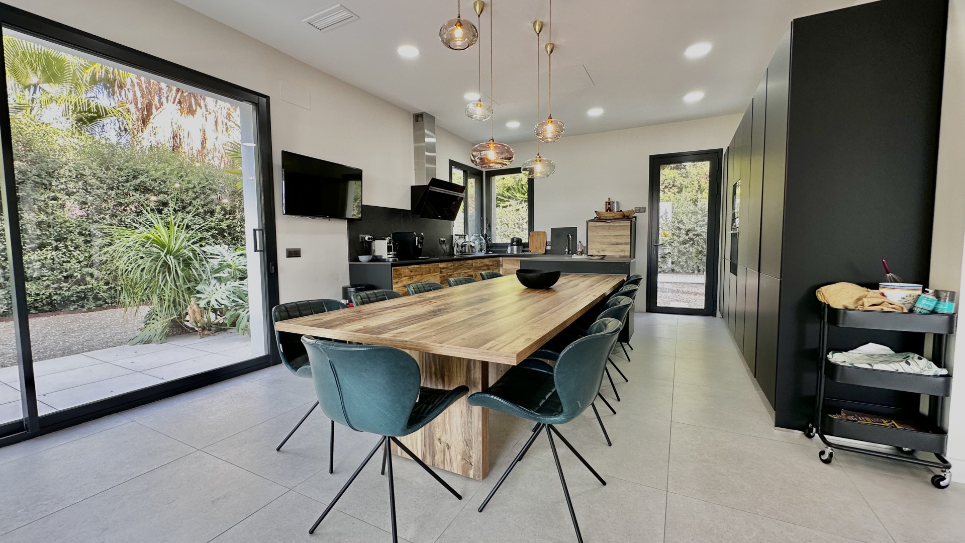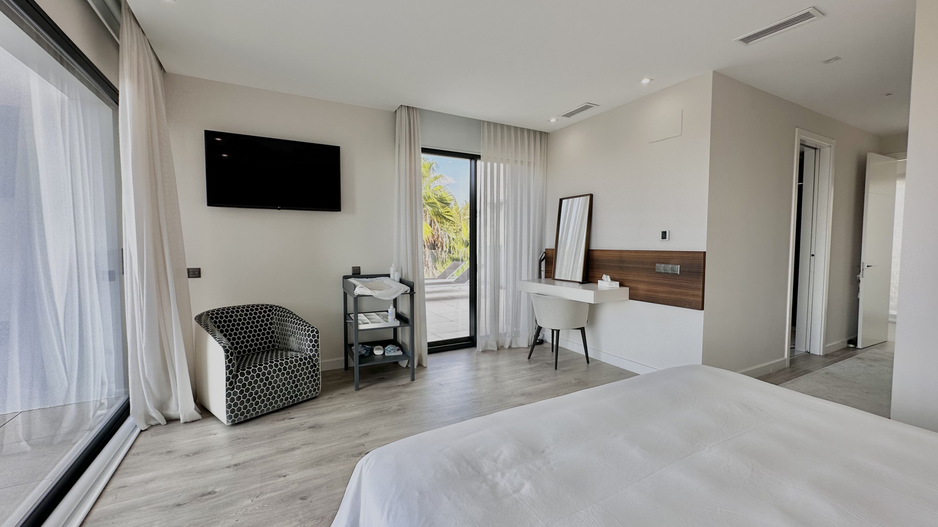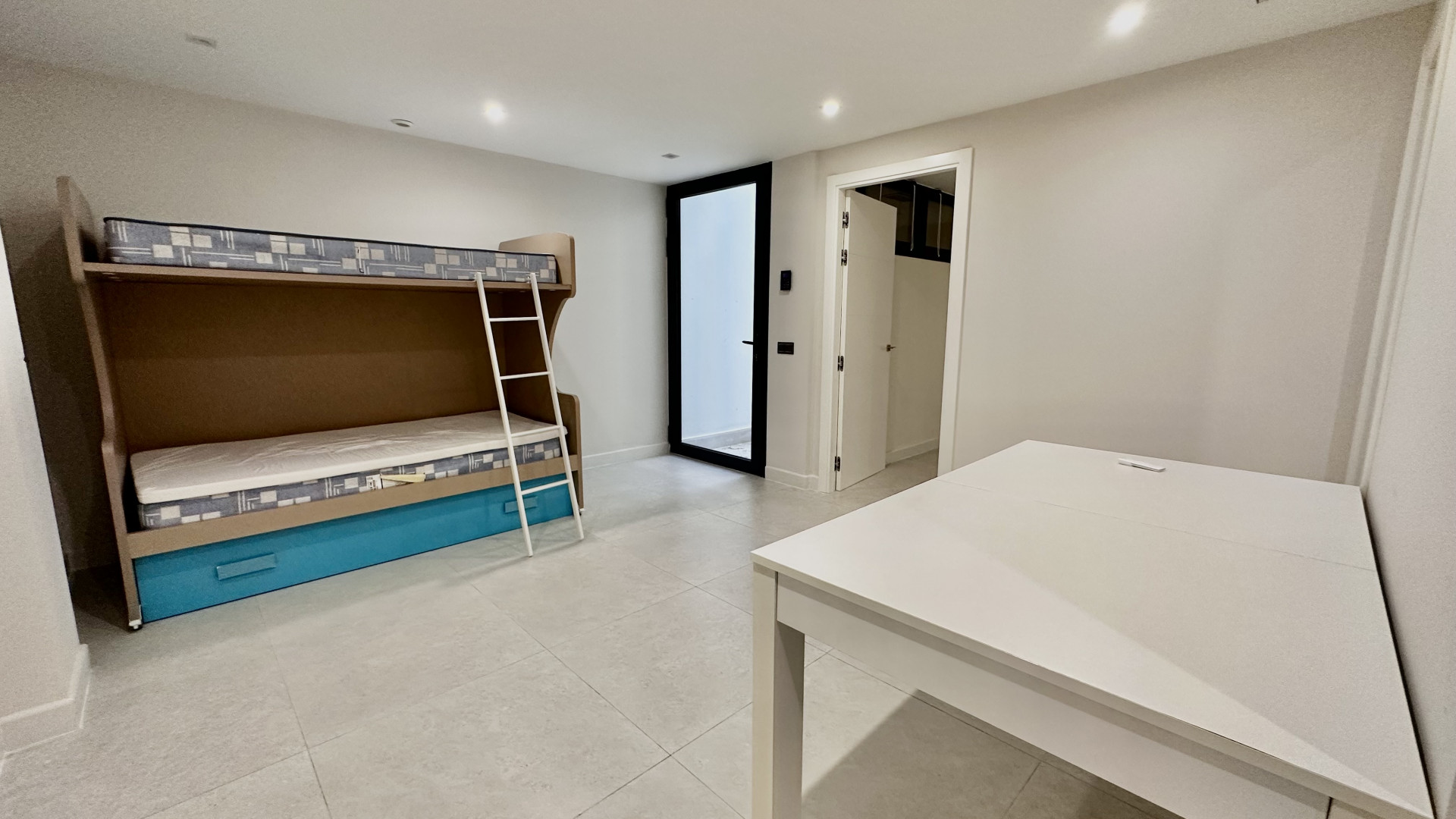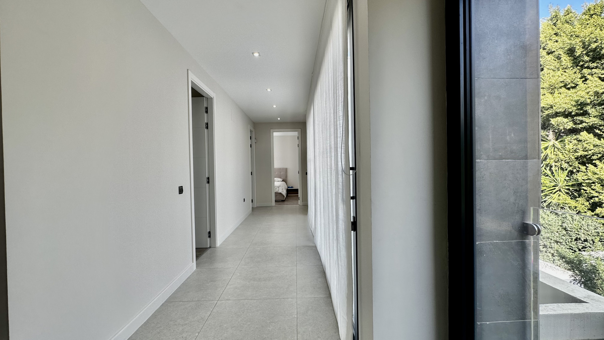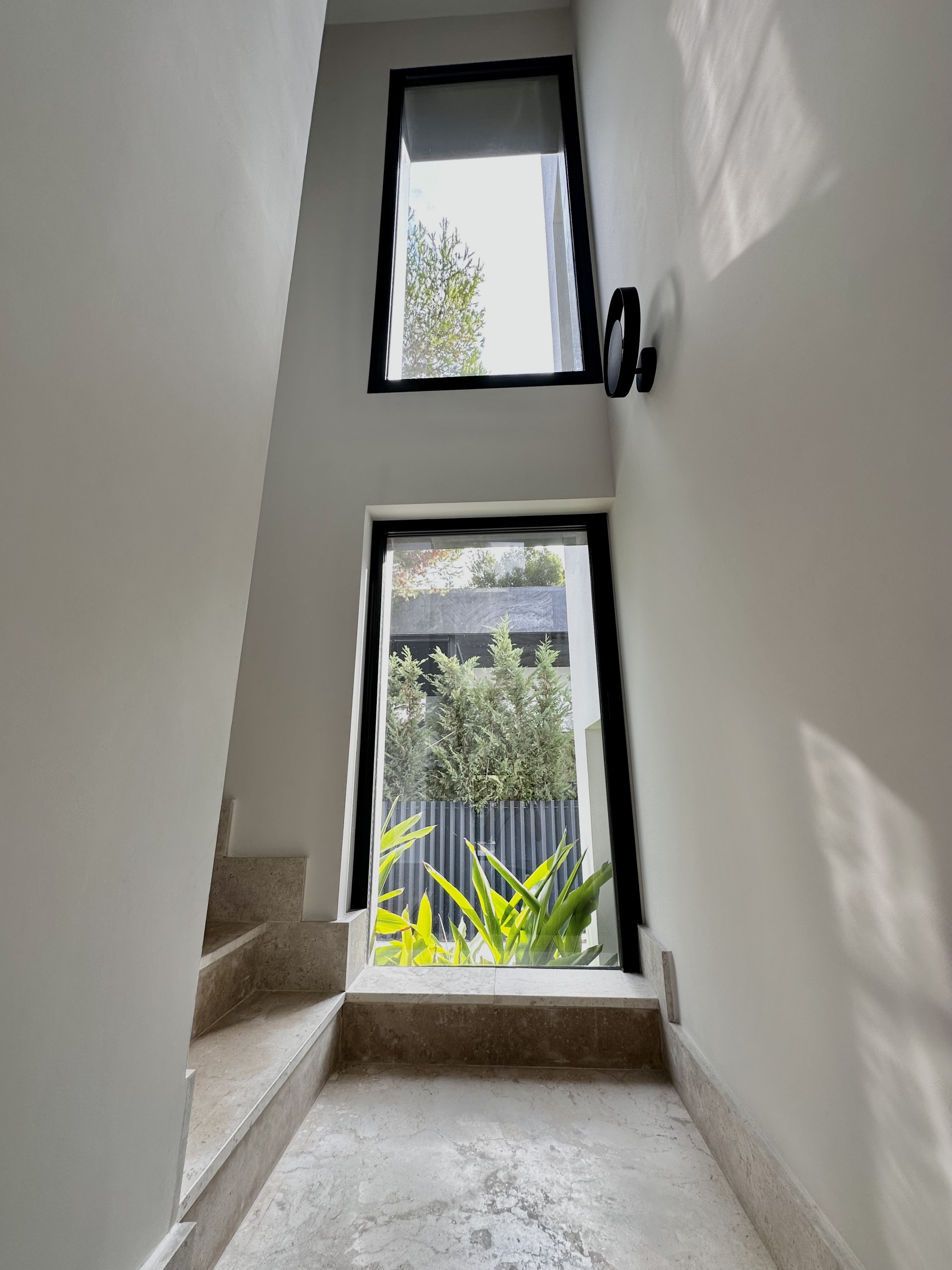 The ground floor consists of a spacious living room with open plan fully equipped kitchen and leads to the covered terraces and a garden, huge windows allows to have natural light all day around.