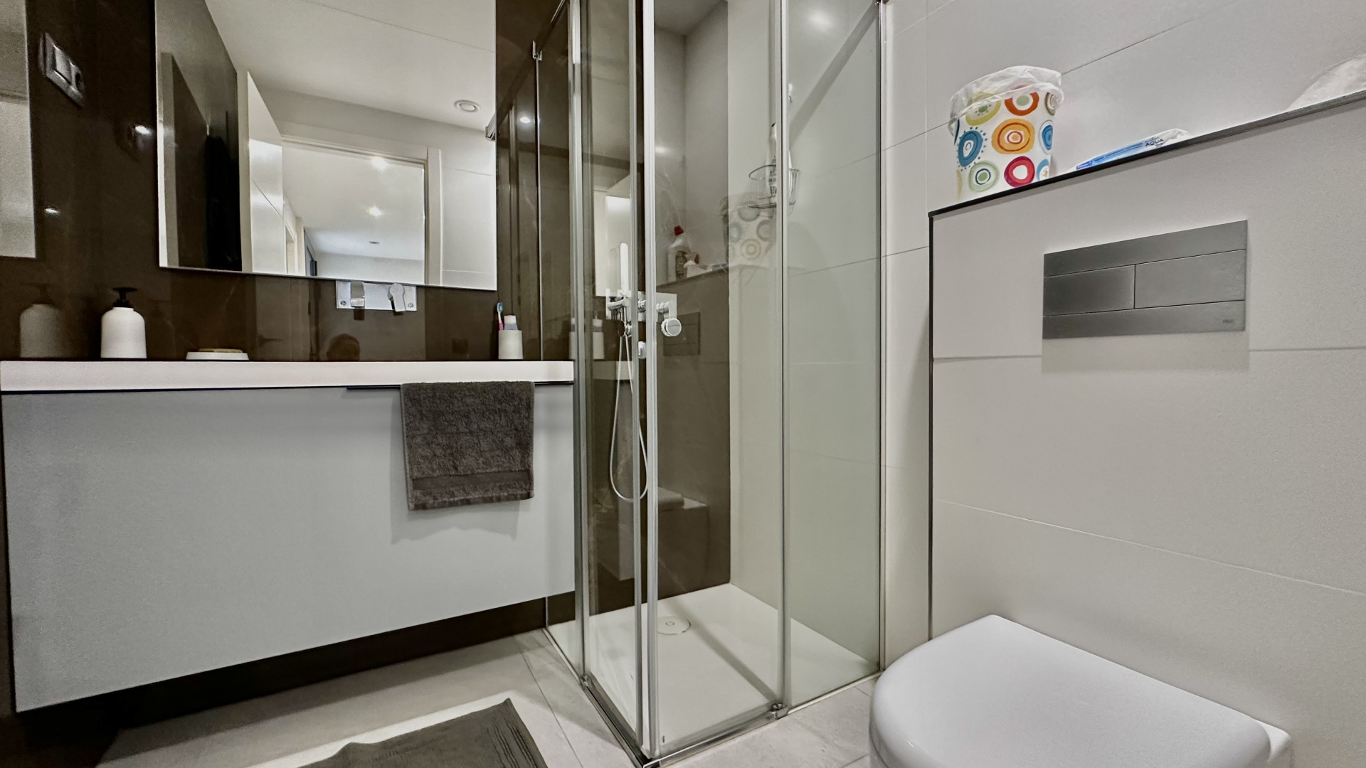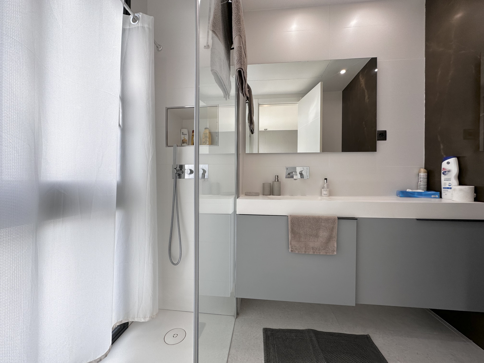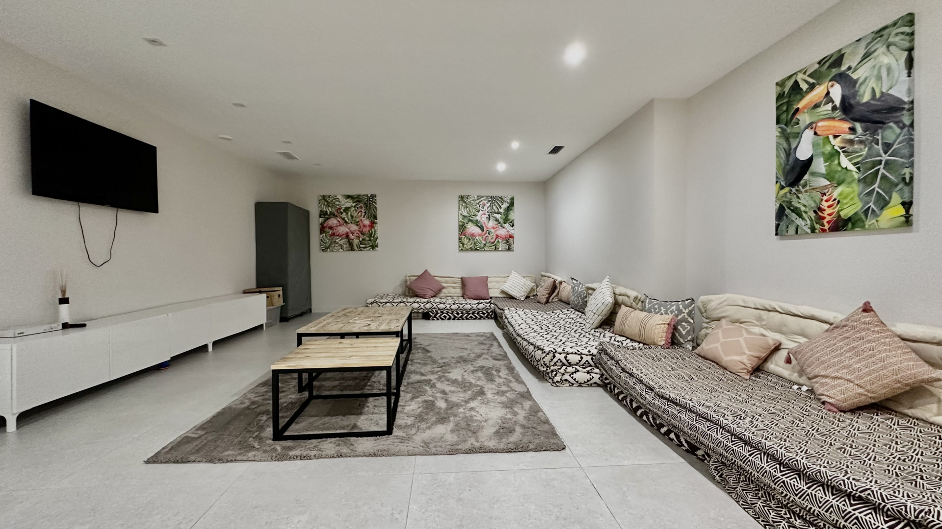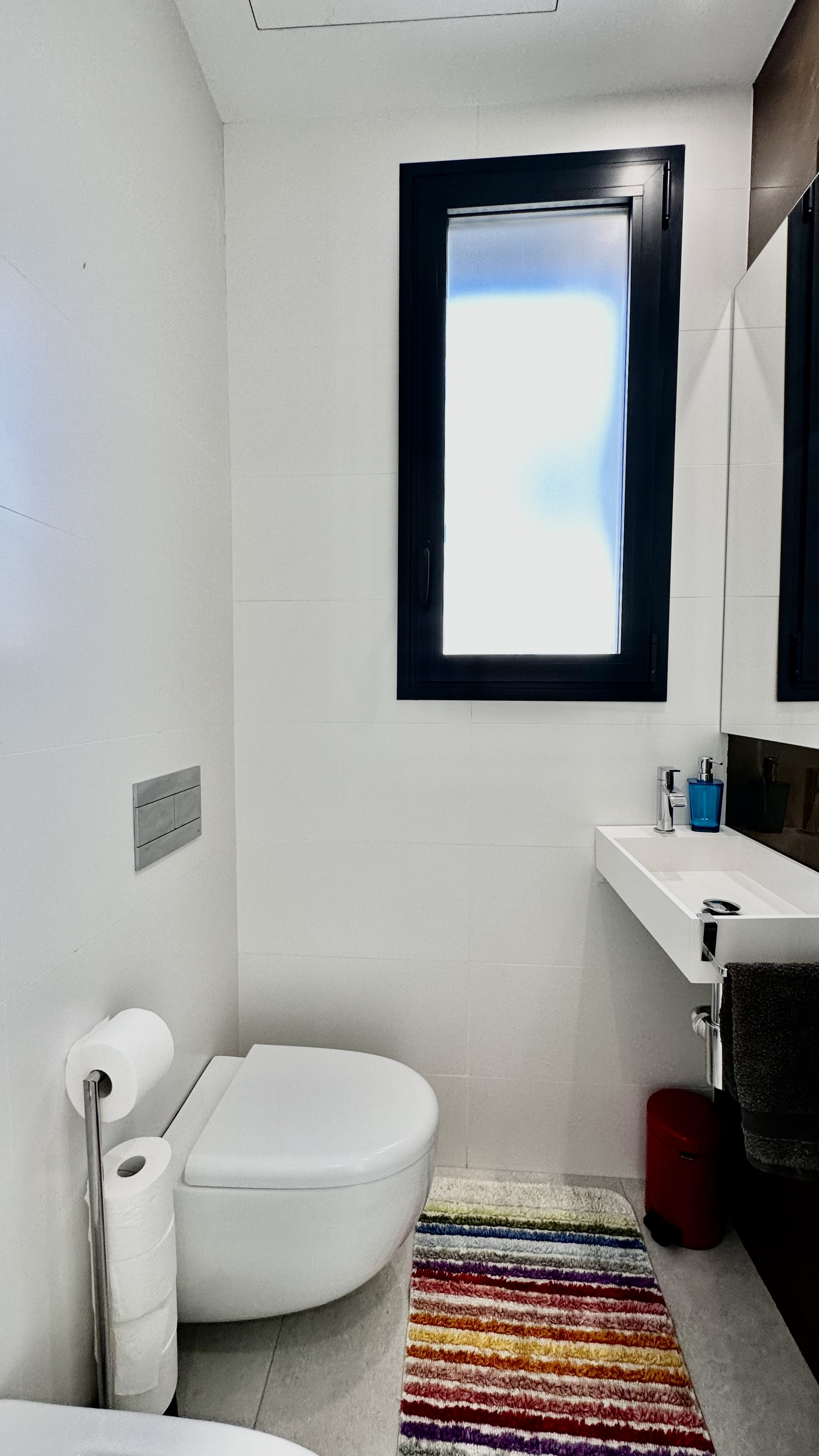 The ground floor consists of a spacious living room with open plan fully equipped kitchen and leads to the covered terraces and a garden, huge windows allows to have natural light all day around.